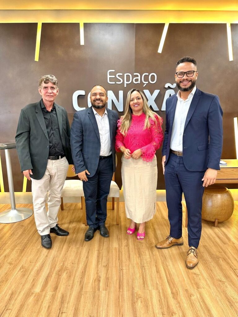 Imagem: Vicente Genildo Ribeiro, vice-presidente da AEPC, Paulo Azevedo, diretor da SEDEC Camaçari, Adriana Marcele Neves, secretária de desenvolvimento econômico de Camaçari, e Fernando Muniz, diretor presidente da AEPC.